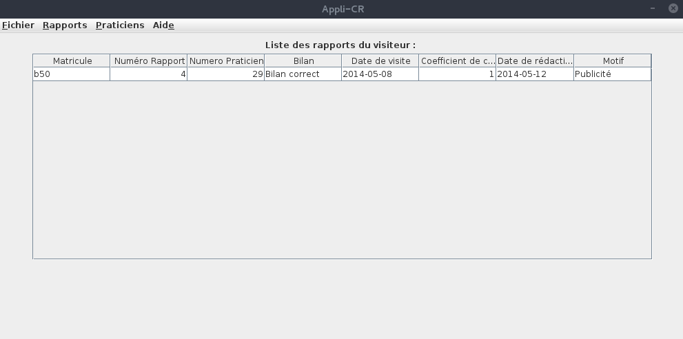 Le laboratoire désire mettre à disposition des visiteurs médicaux une application permettant de centraliser les comptes-rendus de visite. Cette base d'information sera utilisée à des fins d'élaboration de la démarche de communication auprès des praticiens et donnera une vision individuelle et synthétique de l'activité de représentation.